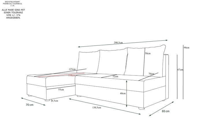 Wszystkie wymiary podano z tolerancją +/-3 %.